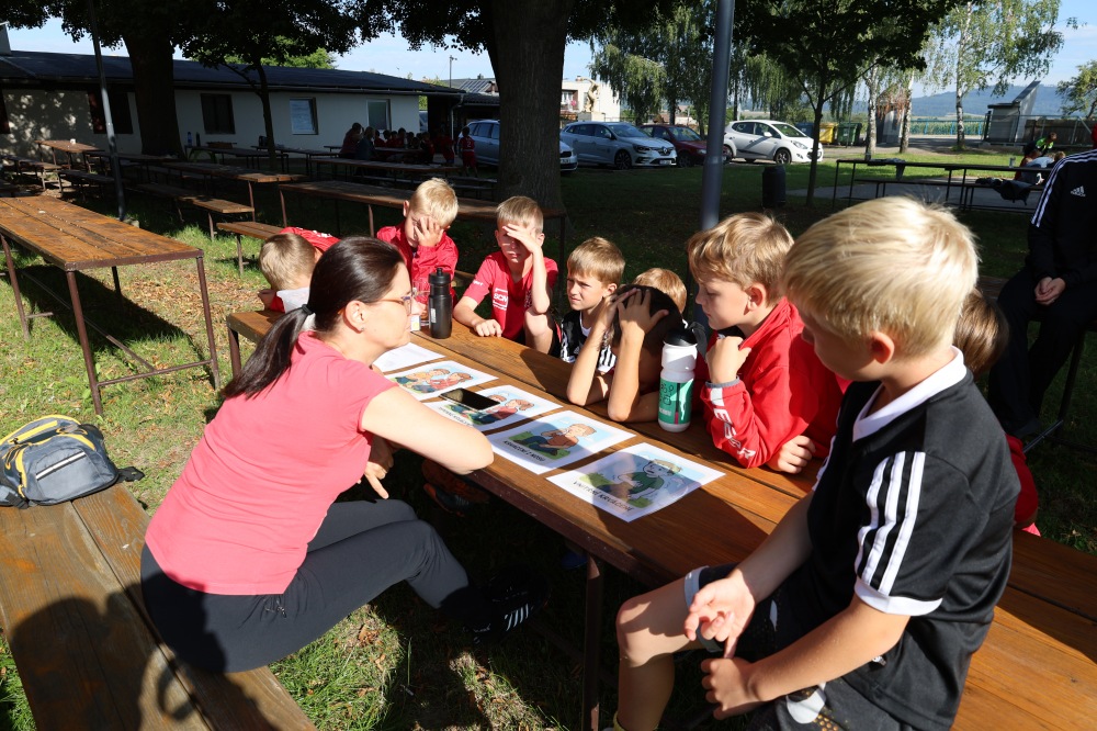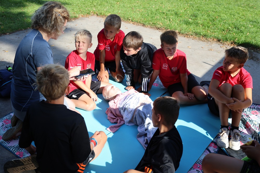 Dne 8. srpna 2025 jsme přijeli na sportovně fotbalový kemp TJ SK Jevíčko, abychom strávili s malými sportovci dopoledne a předali jim znalosti a dovednosti v první pomoci. Se svými kolegyněmi Bc. Ertlovu a Mgr. Pospíšilovou, jsme si připravily tři stanoviště, na kterých jsme malé sportovce zábavnou formou zapojili do různých situací, se kterými se mohou potkat nejen při sportu, ale i v běžných denních situacích s kamarády. Nacvičovali jsme řešení situací, při kterých dojde k běžným odřeninám, krvácení, zlomeninám, úpalu a úžehu, poruchám dýchání, bezvědomí, zástavě srdeční činnosti a dalším ohrožením zdraví. Na jednotlivých stanovištích si vyzkoušeli například použití obvazů na různých částech těla, při různých poraněních, a také použití trojcípého šátku. Dále si nacvičovali postup první pomoci u kamaráda, který má zástavu dýchání nebo člověka se zástavou srdeční činnosti na modelu figuríny a další dovednosti. Strávili jsme s malými sportovci aktivní a naučné dopoledne. Za jejich snahu a aktivitu jsme je odměnili certifikátem o absolvování nácviku první pomoci a malým dárkem.